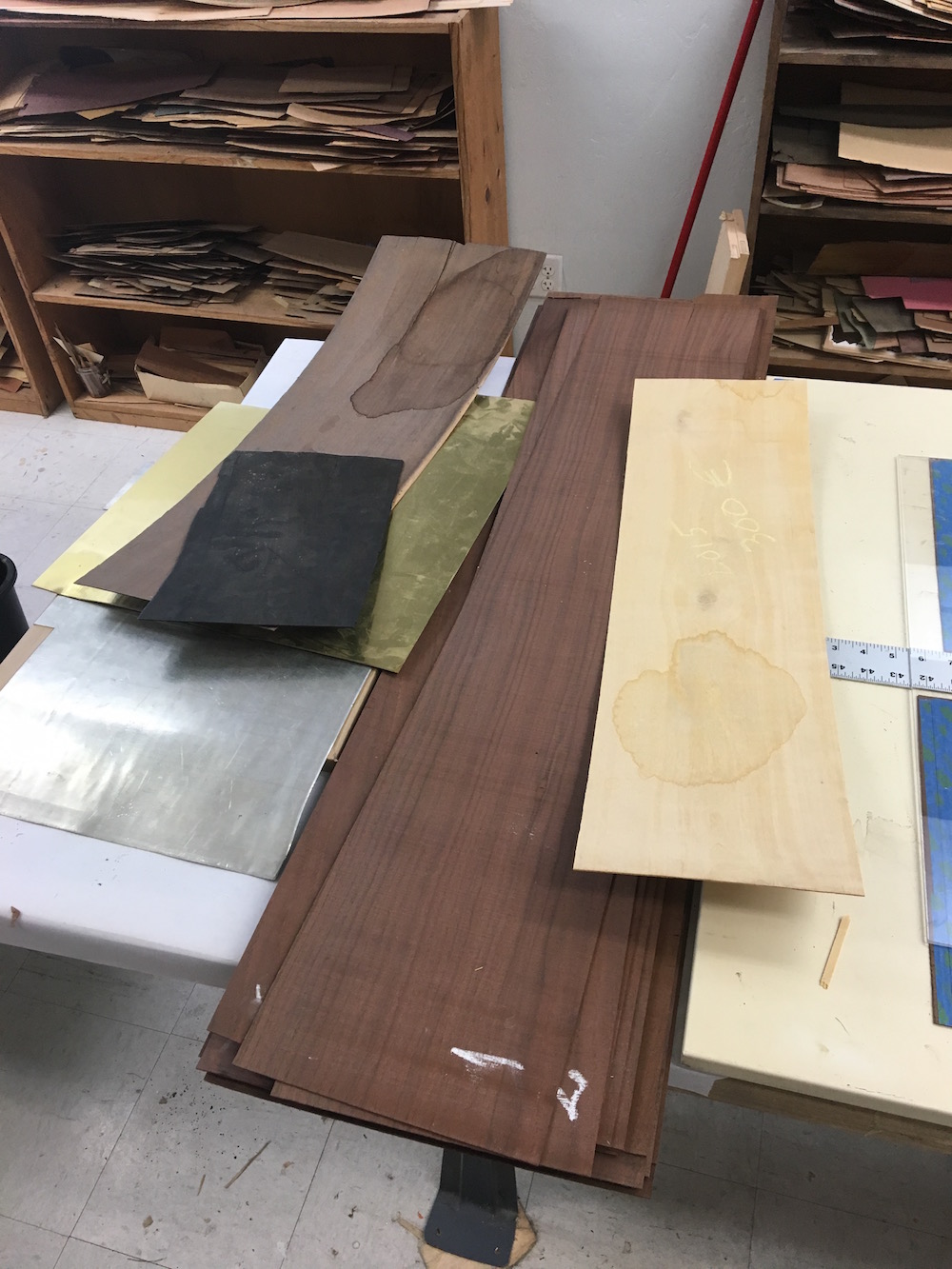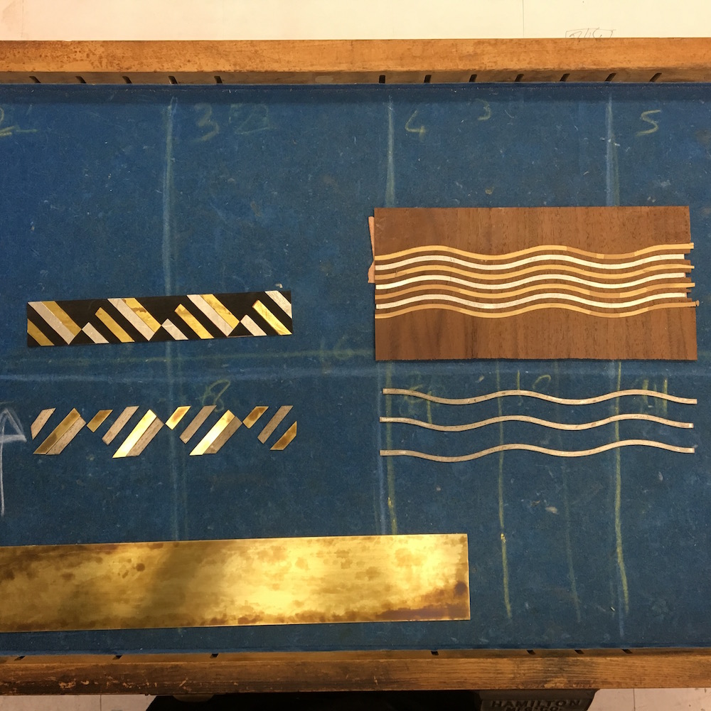 In this particular case, the metal pieces needed to match the patina of other brass elements in the room. This forced us to find a way to pre-finish the elements and install them later in the composition, avoiding this way chemical contamination to the nearby woods. I decided to cut the elements in superposition like the “Boulle” technique, therefore I had leftover elements that could be mounted as dummies in the marquetry and kept the final elements that received the patina aside.
