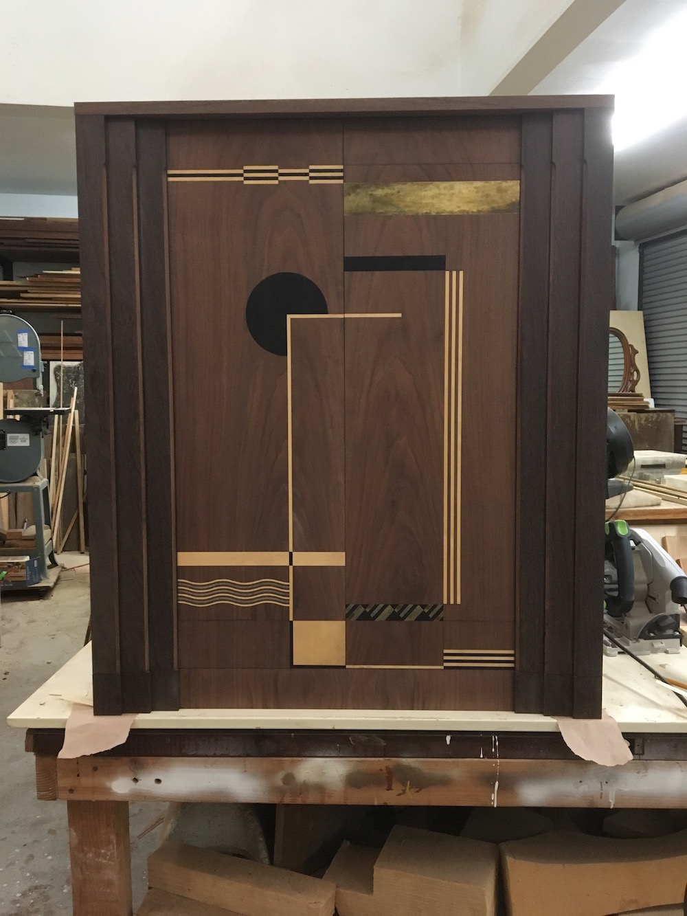 A couple of months ago, a Los Angeles designer contacted us to create an art deco cabinet. The inspiration for this project was the stunning lobby elevator doors of the Bullocks Wilshire building in LA created by the architects John and Donald Parkinson. This commission was very exciting. It also allowed us to step outside the usual realm of our more classical productions,. The goal was to bring traditional techniques and high-quality materials to magnify a powerful classic design.