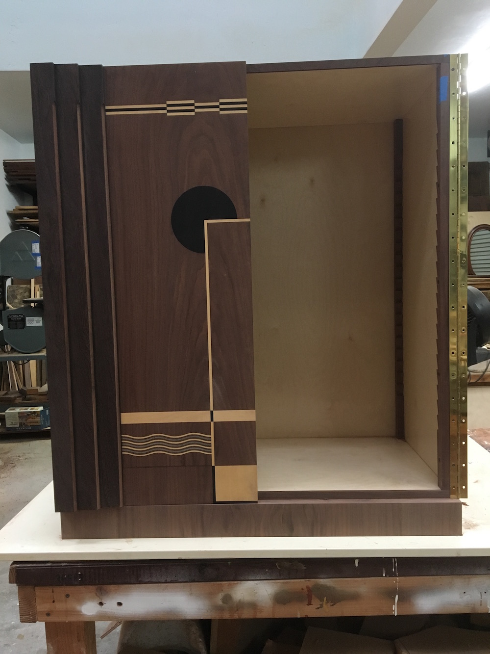 Nest step is gluing the pilaster to the doors and the veneer to the kickplate, taking care that the walnut grain flows perfectly thrughout the composition.