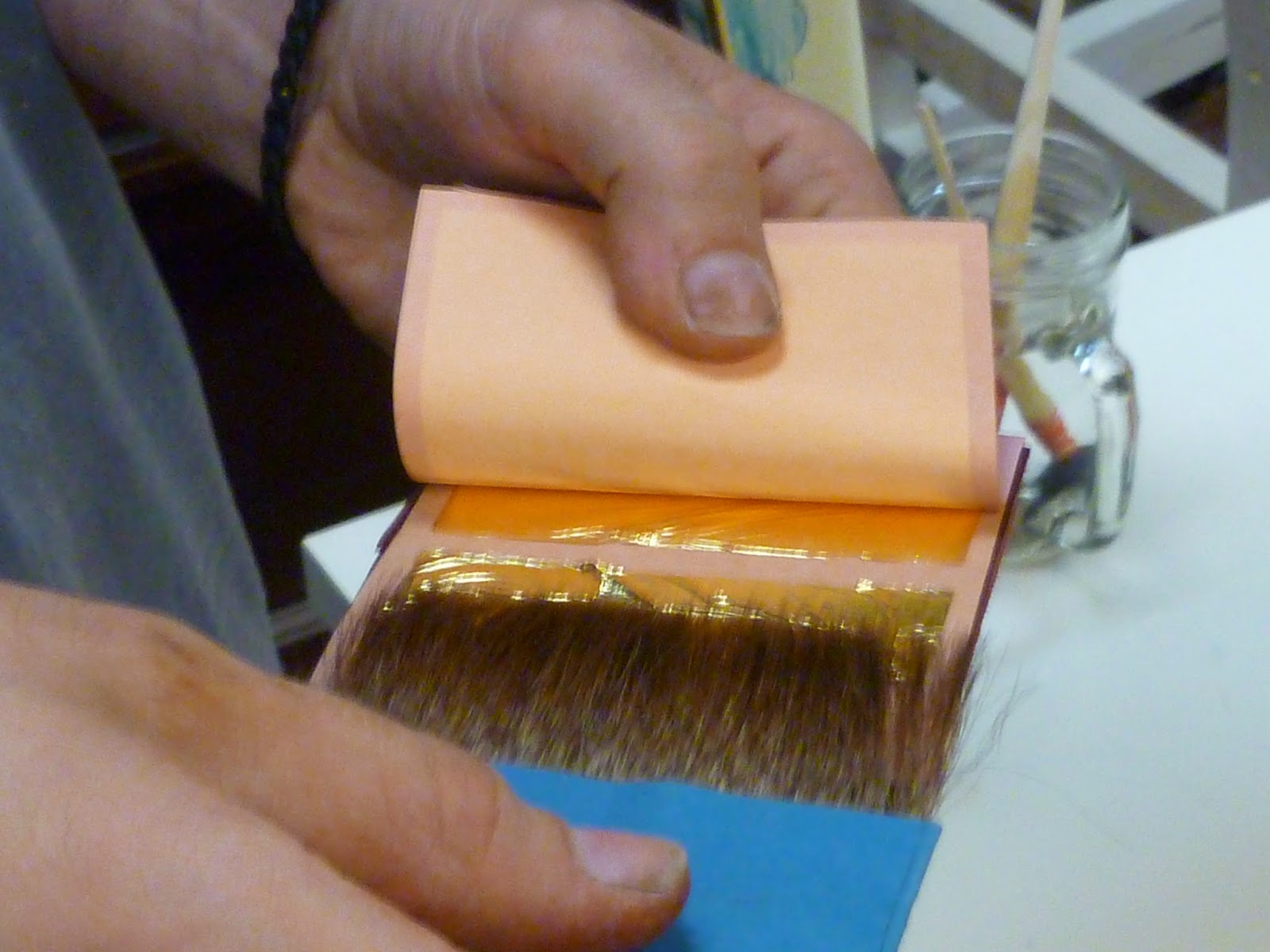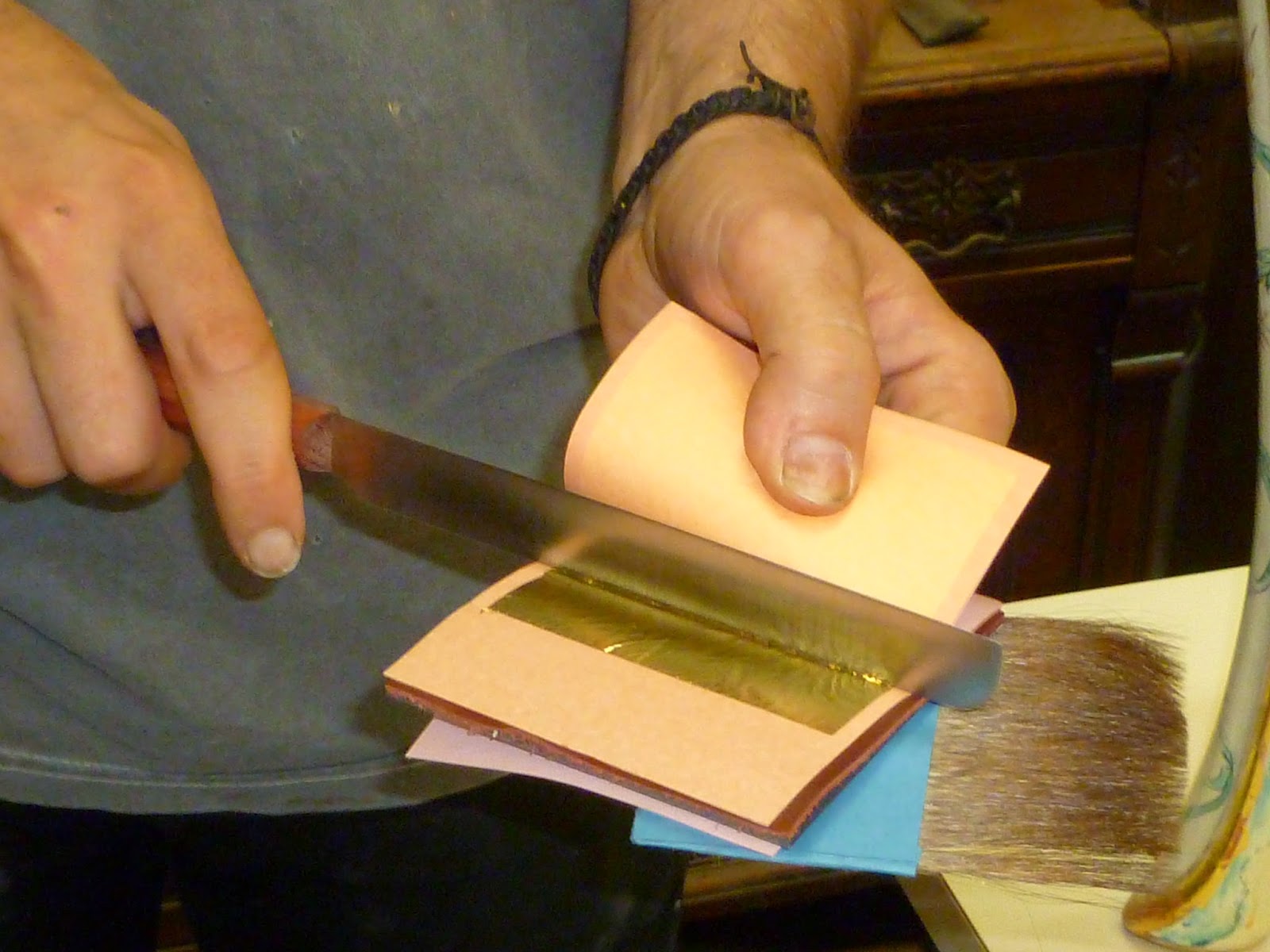 Next step is actually the gilding. To make gold leaf, the gold has been hammered down until it is so thin you can see light through the leaf. The leaves are extremely fragile on top of being extremely expensive.