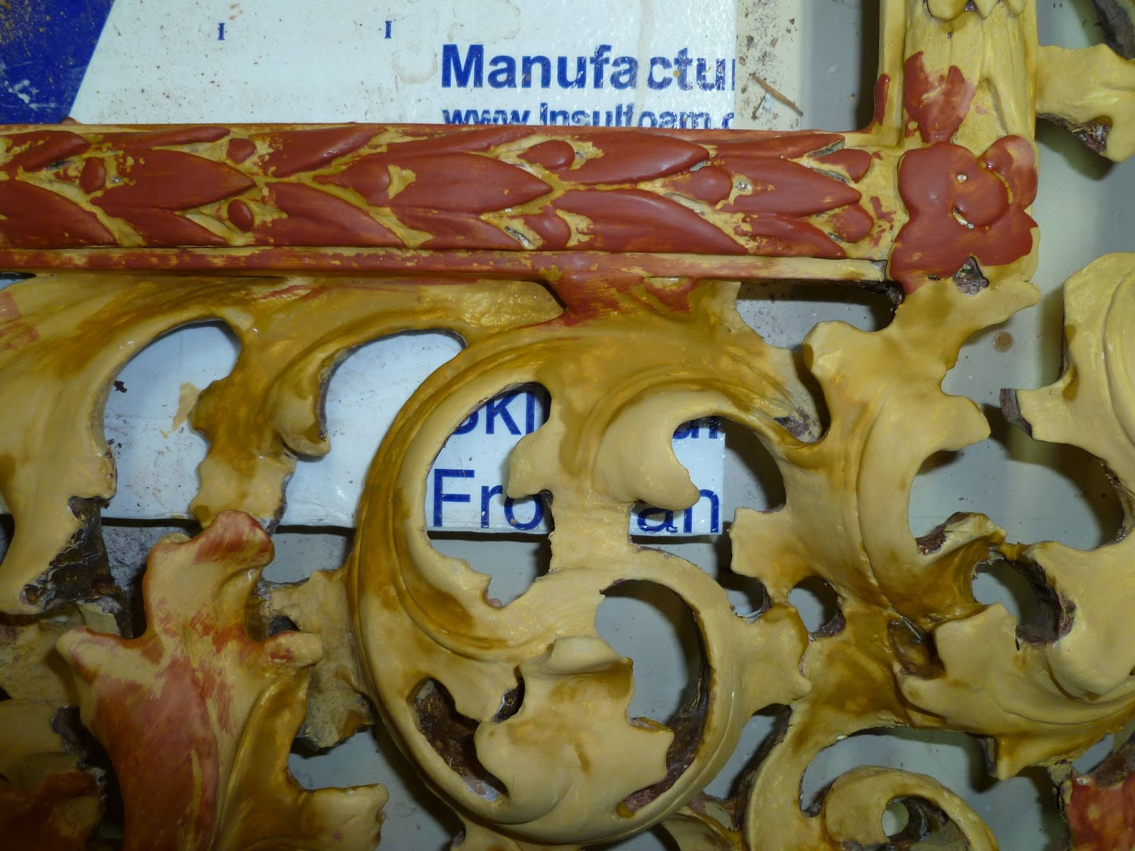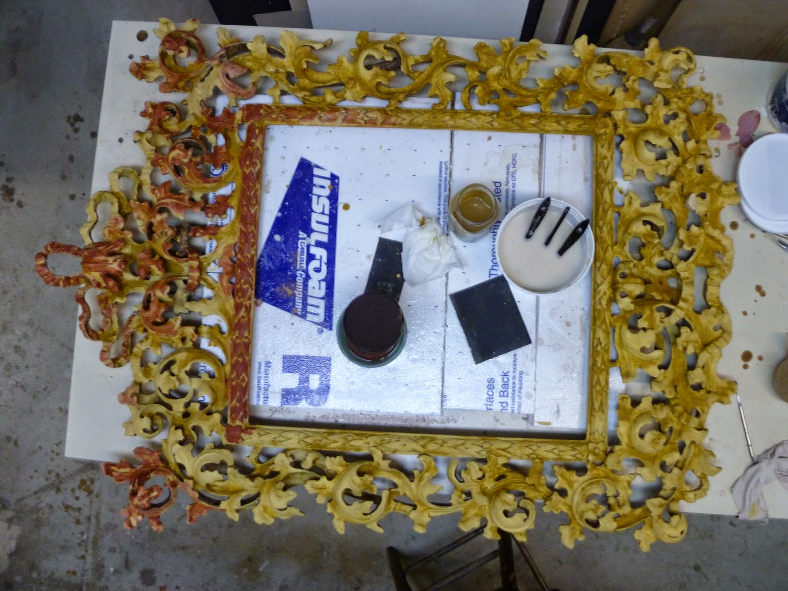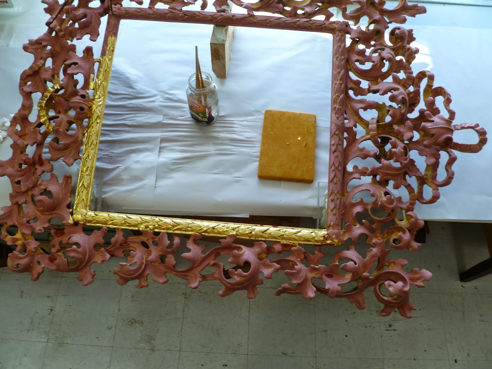 Coming back form Portland, Oregon where I learn with Nancy Thorn I started on a restoration on a frame from our client. The mirror had been “restored” with gold paint over the giding on 50% of the frame.