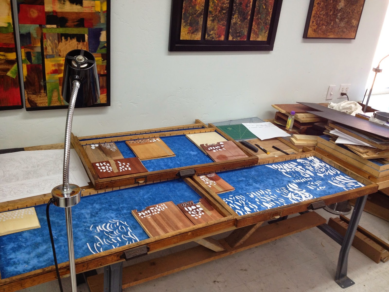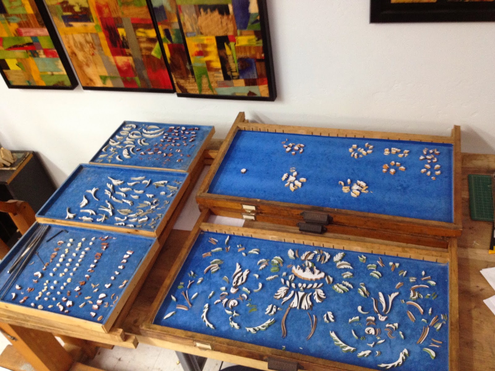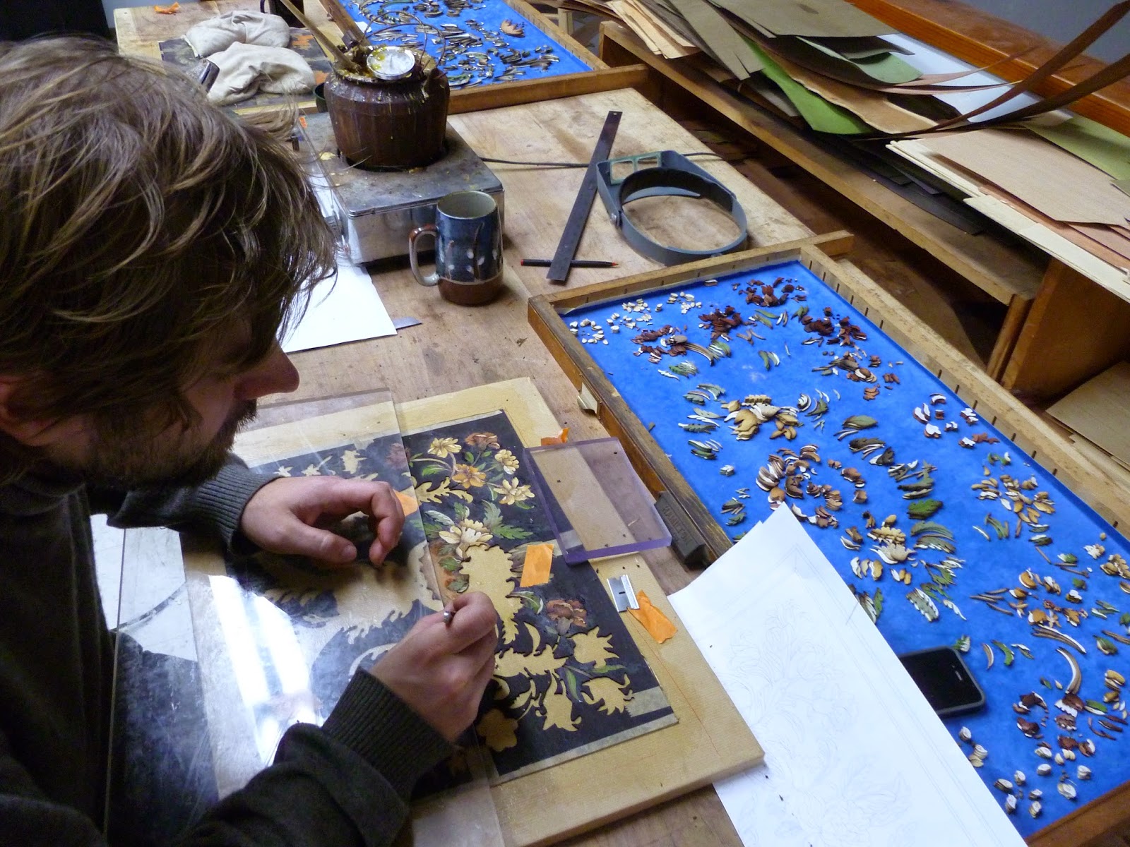 Once the background is cut the marquetry picture is put together on an assembly board using hot hide glue.