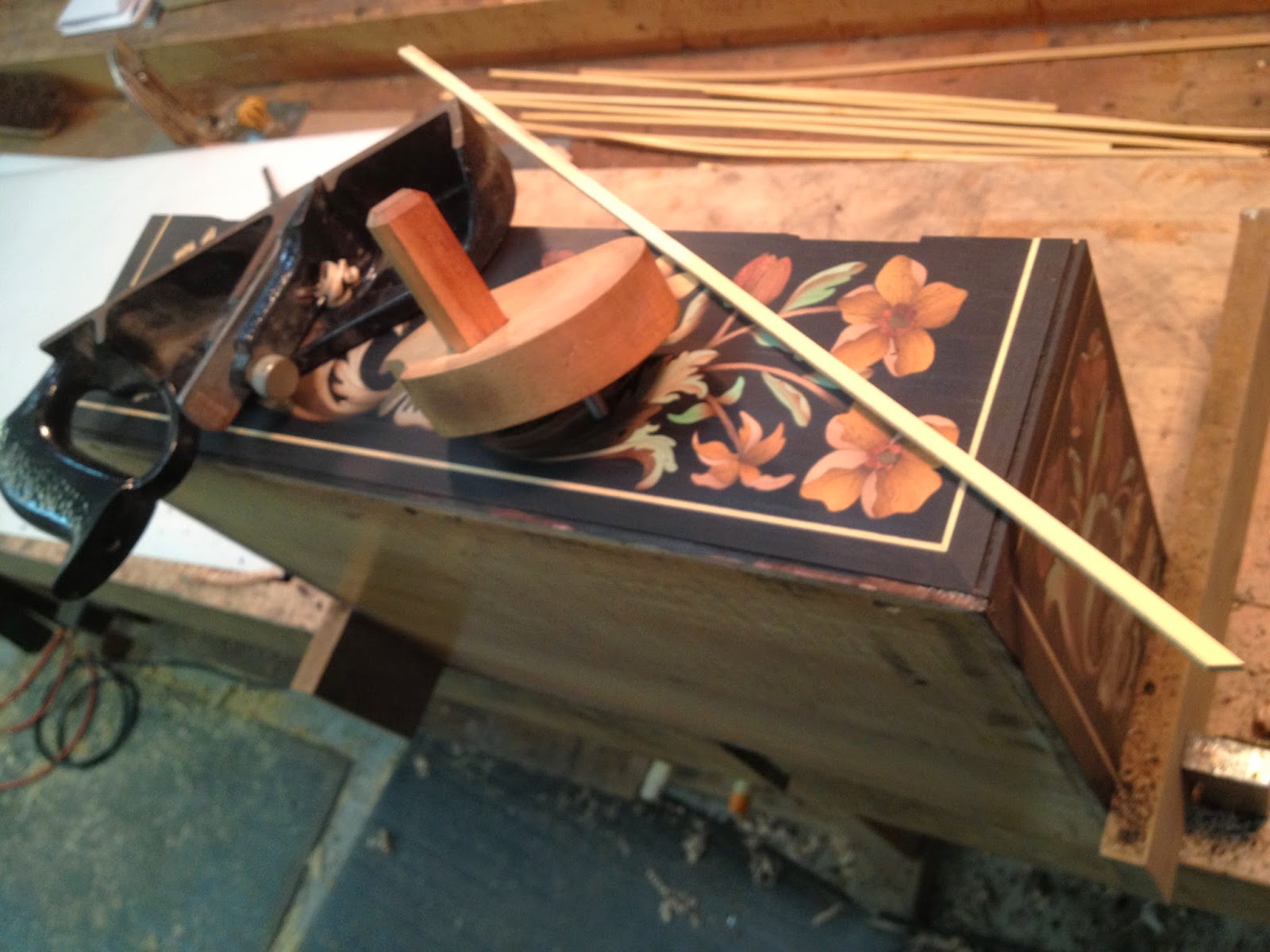 A little mastic for the couple gasp here and there, and done with the marquetry. In the meantime Patrick was working on the box itself. Hand made joinery, full blind dovetail for the corners. Patrick did a post couple weeks ago on dovetails featuring the full blind one.