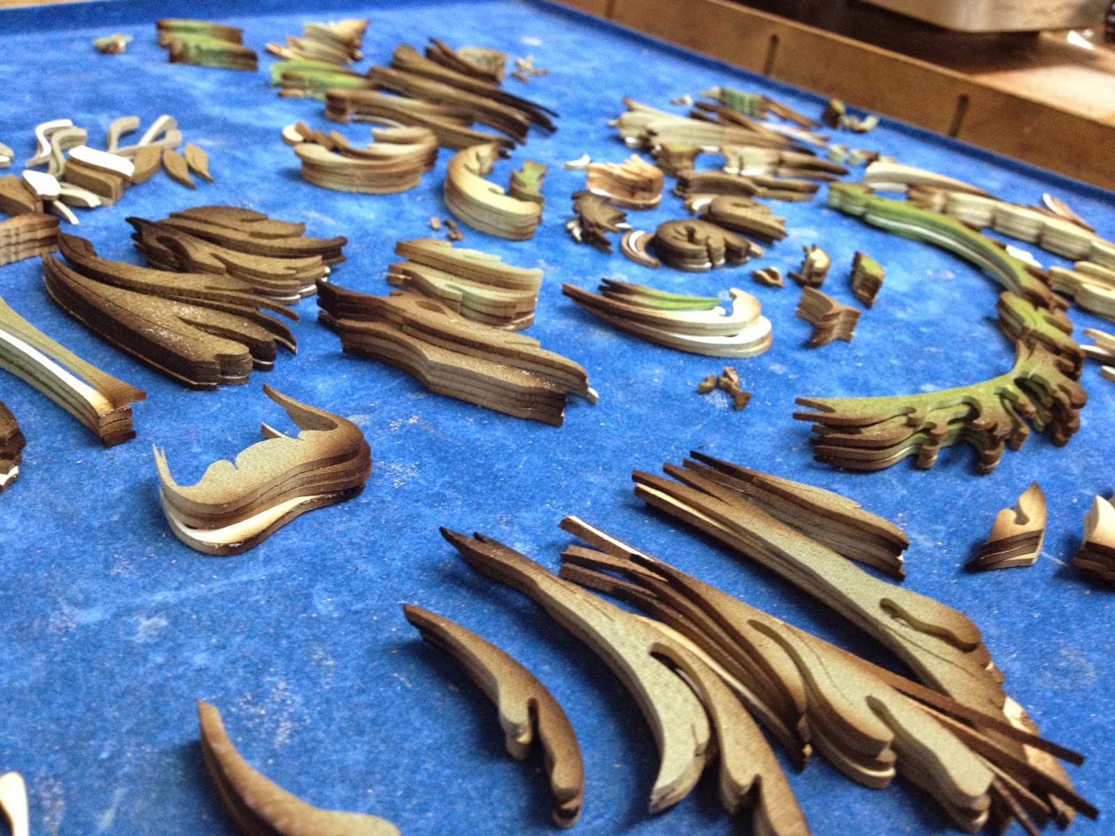 First you need each pieces on paper cut out from the multiple copies of the drawing in order to have them all laid out, then distributed to the 4 layers packs