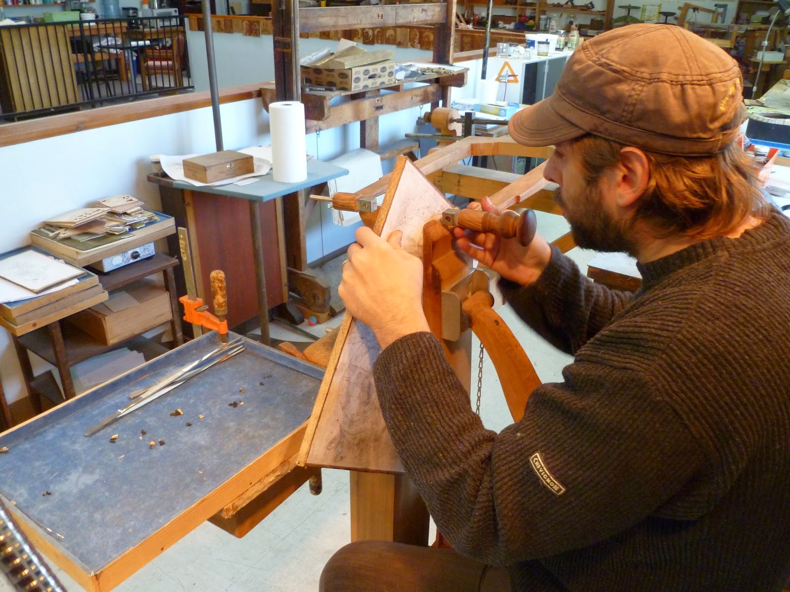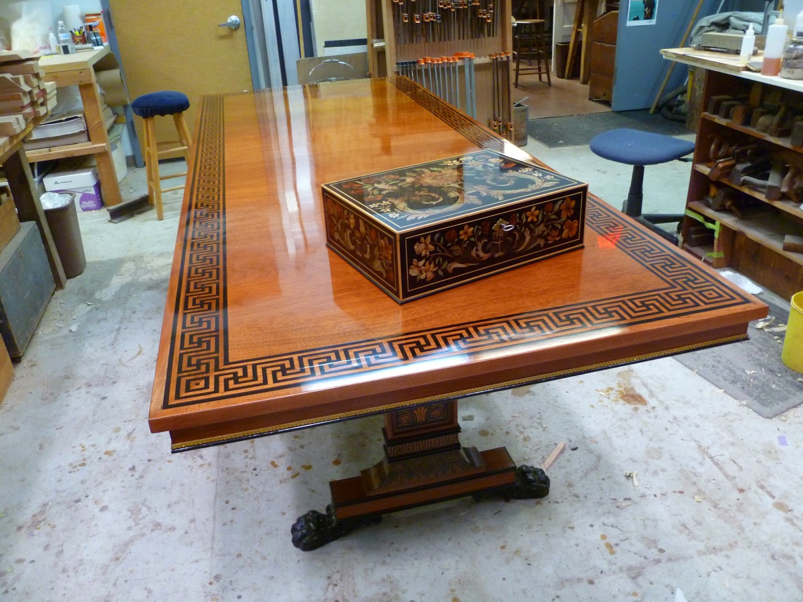 Patrick chose the woods an laid out the palette. We used sawn veneer as it was used at the period, using an ebony background with 20 some other wood veneer, both natural colors and dyed.