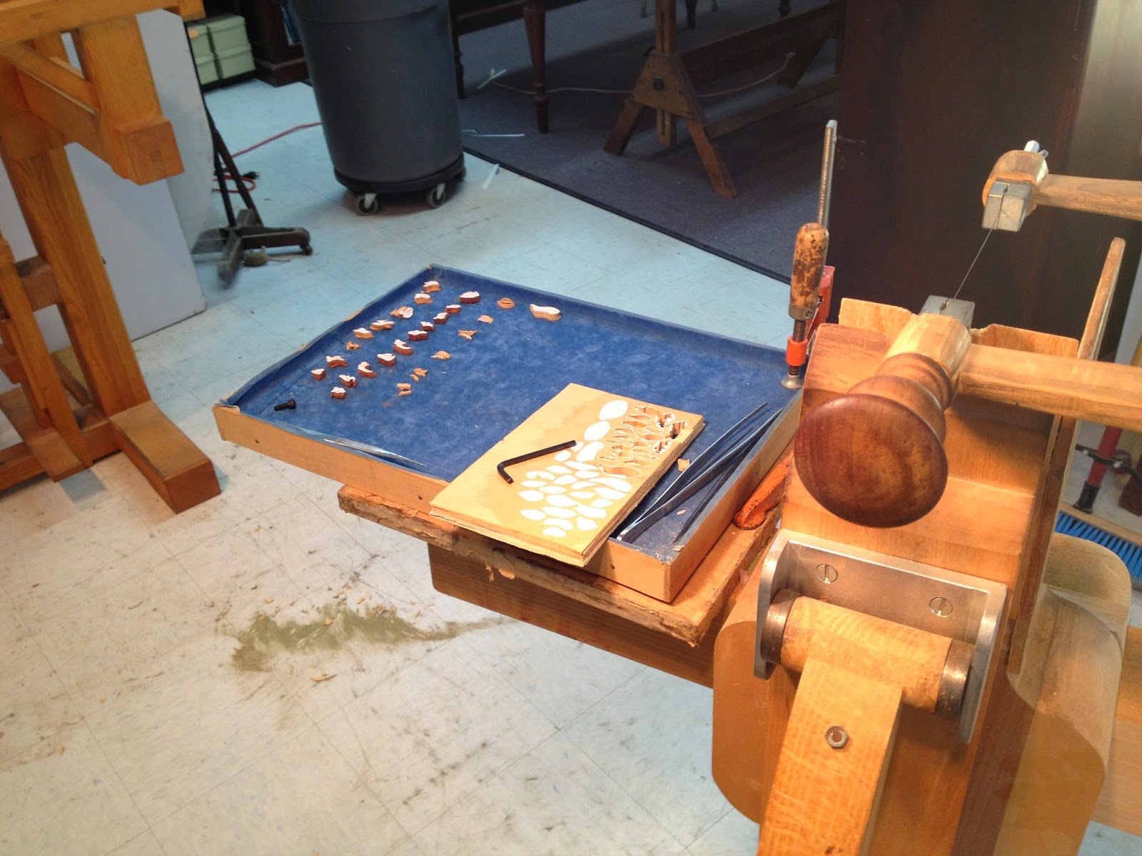 Once glued on the pack using hot hide glue, the packs are riveted using veneer nails 5harder and harder to find) in order to stabilize the pack and make them real tough to avoid breakage. Then I did cut them using, of course, the chevalet. Best marquetry cutting tool ever in my opinion and i used quiet a variety of devices and machines and always came back to it.