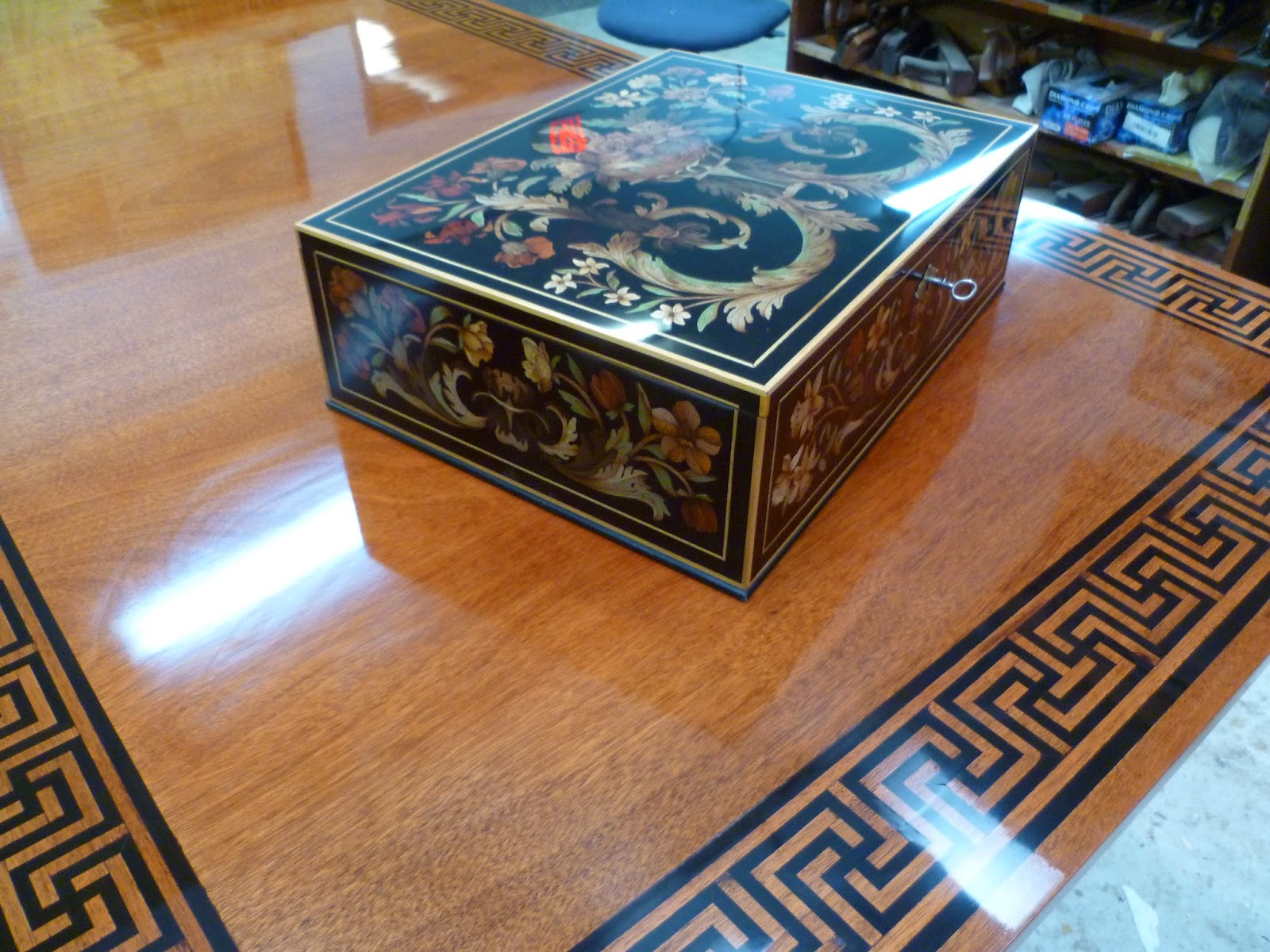 We kept the overall layout but focused on drawing it at the best level from the period, we had in mind of course the Painting in Wood of André-Charles Boulle. We focused on staying true to the period with one exception, we did not use the painting in wood technique (stack cutting), but the piece by piece technique (classic method). This little transgression alowed us to produce a series of 4, lowering therefore the price of each box, keeping the possibility to customize the inside to the desire or need of the clients.